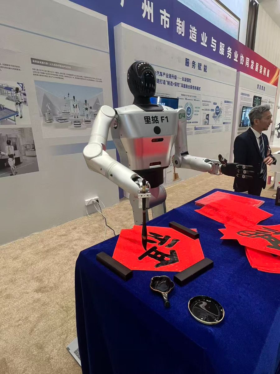 在大会的展示区,一架具身机器人吸引了众人的目光。银灰色的机械臂轻悬于红纸之上,蘸墨、运笔、回锋,这架人形机器人以毫米级的精度,书写出传统的中国“福”字。