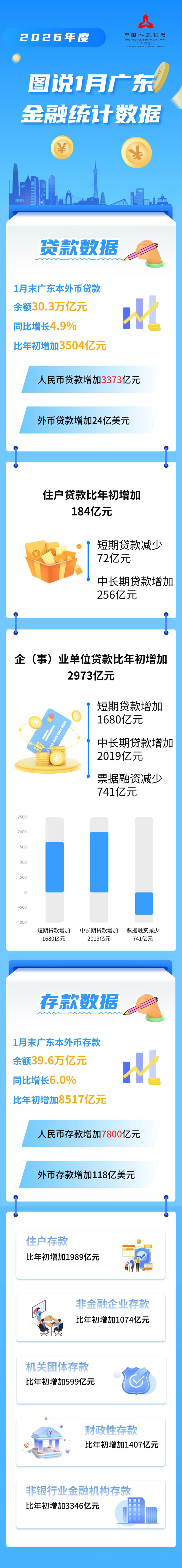具体来看,2026年1月末,广东本外币贷款余额30.3万亿元,同比增长4.9%,比年初增加3504亿元。其中,人民币贷款增加3373亿元,同比少增1499亿元;外币贷款增加24亿美元,同比多增61亿美元。