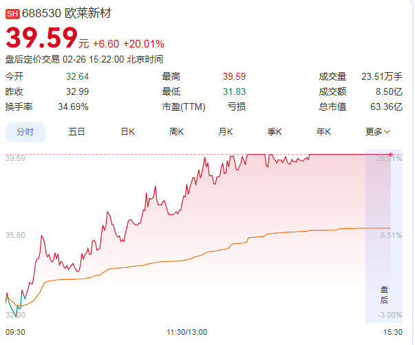 2月26日,欧莱新材强势涨停,收盘价为39.59元,成交额为8.50亿元,总市值攀升至63.36亿元。据统计,自2026年1月27日以来的17个交易日内,欧莱新材股价累计涨幅超过112%,表现非常亮眼。