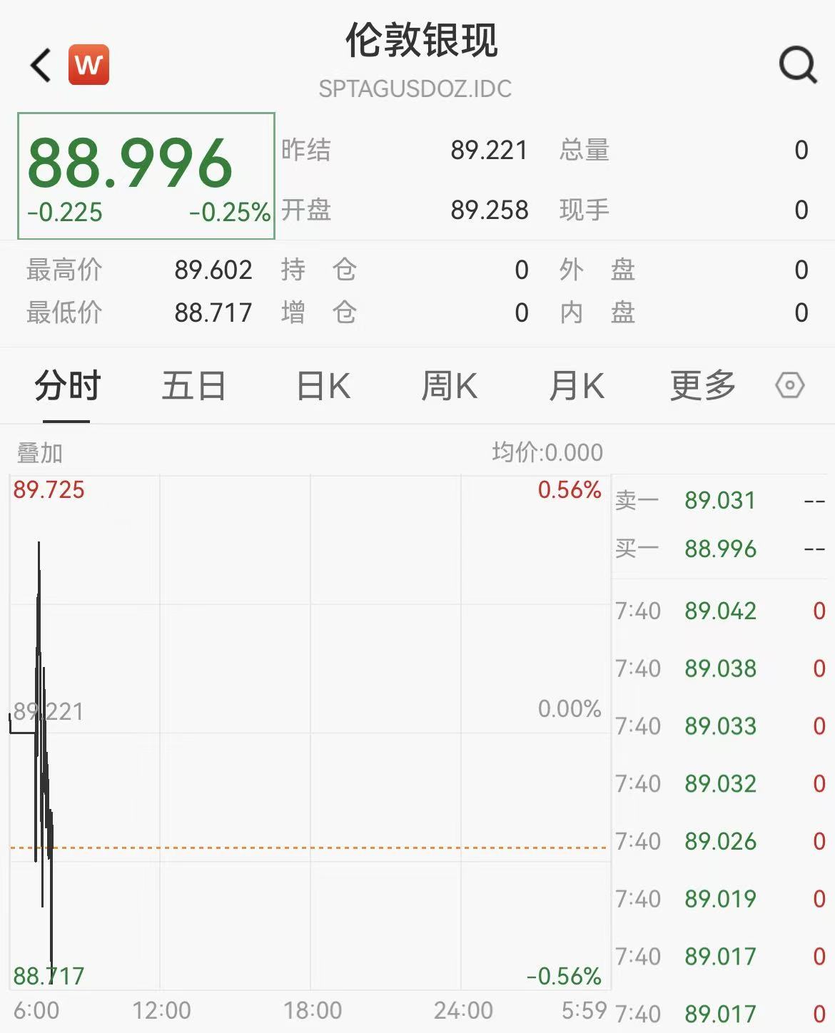 现货白银向下跌破89美元/盎司,日内下跌0.12%。