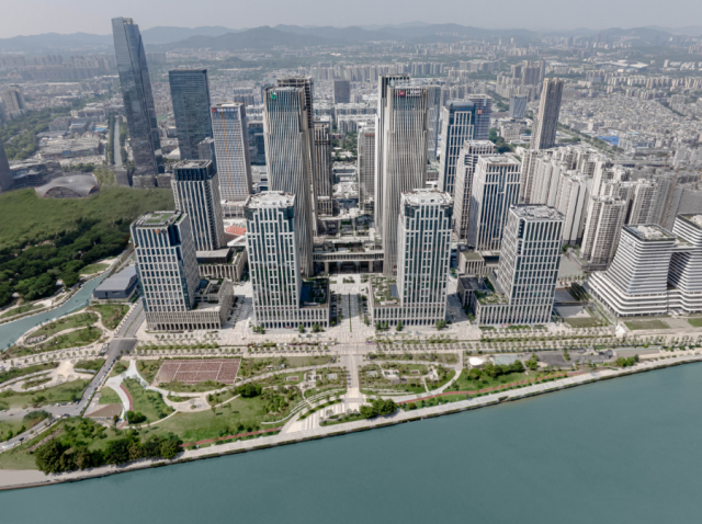 目前,金融城起步区基础设施与商业配套项目建设进度为87%,其中临江大道已通车,方城、滨江公园已投入使用。