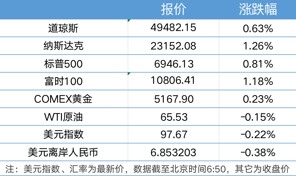 1、美股三大指数集体收涨,纳指涨1.26%,标普500指数涨0.81%,道指涨0.63%,大型科技股全线上涨,奈飞涨约6%,微软、Meta涨超2%,英伟达、英特尔、特斯拉、亚马逊涨超1%,苹果、谷歌小幅上涨。加密货币概念股普涨,Circle涨超35%,Coinbase涨超13%,BMNR涨超10%,Strategy涨超8%,Robinhood涨超5%。