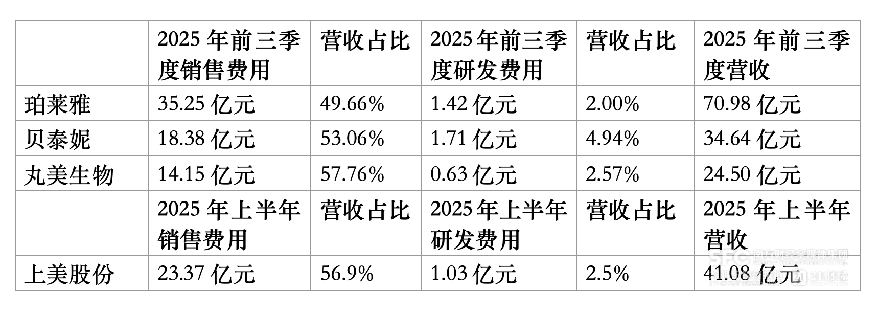 21世纪经济报道记者梳理发现,2025年前三季度,丸美生物的销售费用为14.15亿元,占营收的57.76%,已超过同期营收的一半;同一时期,贝泰妮的销售费用为18.38亿元,也占到营收的53.06%;珀莱雅的销售费用为35.25亿元,占营收的49.66%。