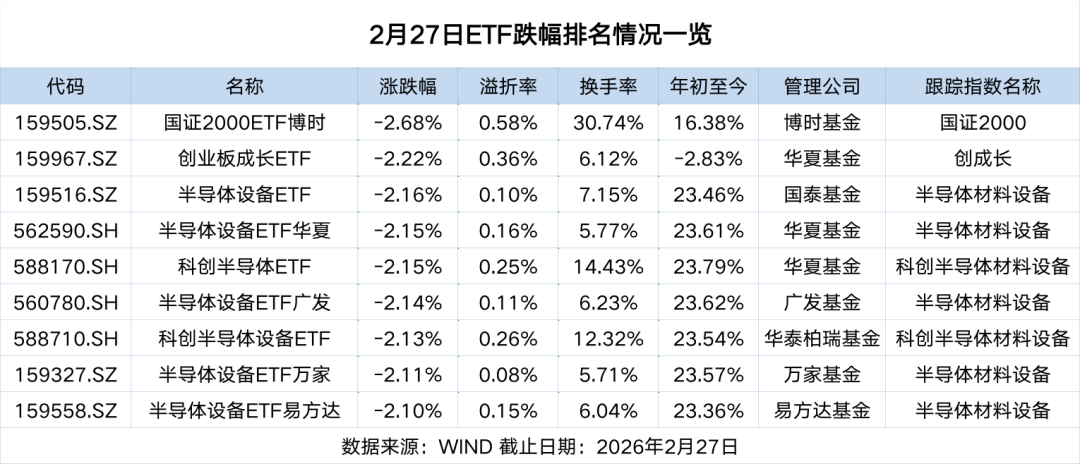 跌幅方面,有448只ETF下跌,半导体设备ETF大幅下挫,通信ETF、创业板成长ETF跌幅居前。