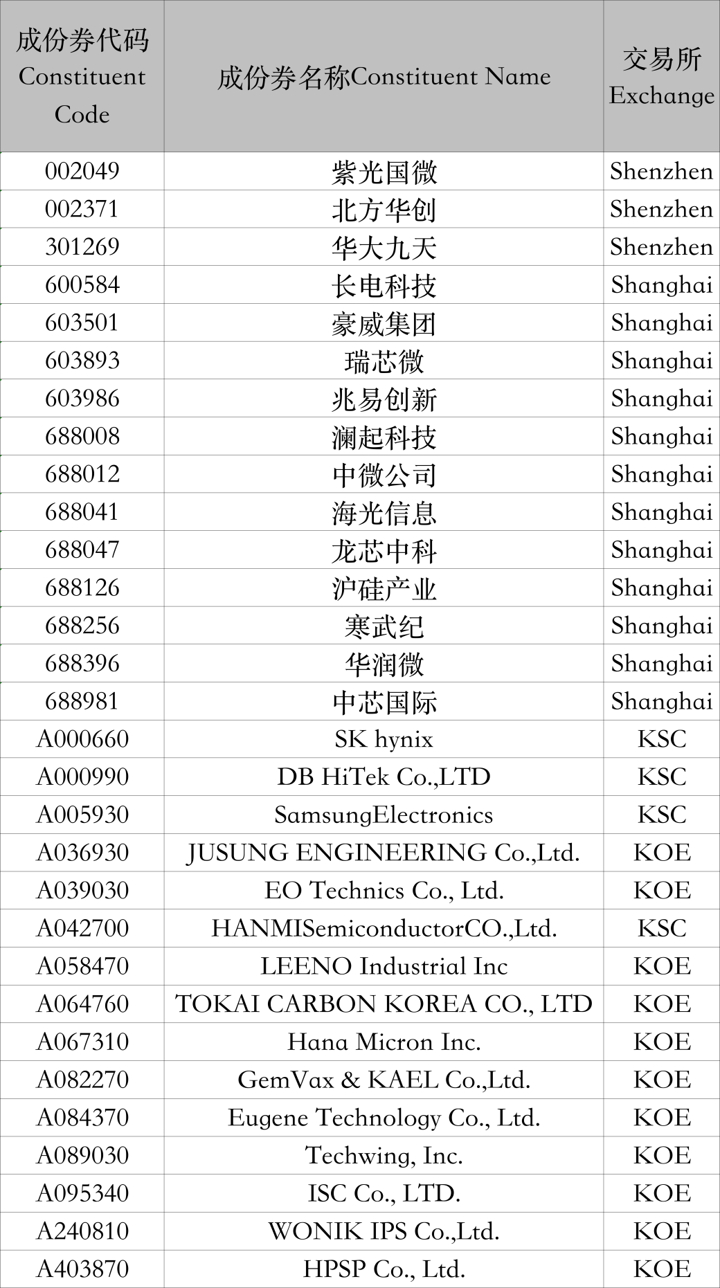 截至目前,指数前十大权重股依次为:三星电子(21.19%)、SK海力士(18.25%)、寒武纪(4.92%)、海光信息(4.69%)、中芯国际(4.66%)、北方华创(4.23%)、兆易创新(4.13%)、澜起科技(3.77%)、韩美半导体(3.54%)、中微公司(3.21%)。