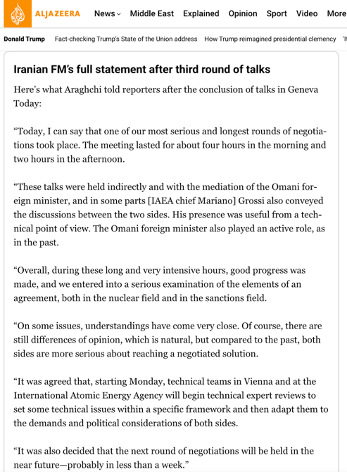 目前结束的第三轮谈判同样在日内瓦进行,阿曼外交大臣宣布会谈取得“重大进展”,并宣布下周将在维也纳就技术问题继续讨论。考虑到维也纳是国际原子能机构总部所在地,这一安排很大程度上强化了技术谈判和核查议题的中心地位。