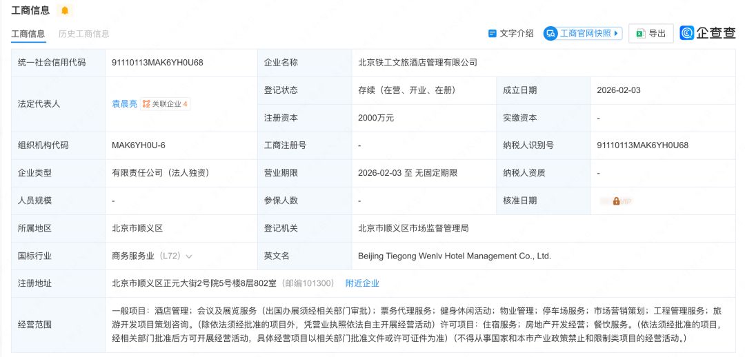 此次新成立的北京铁工文旅酒店管理有限公司,核心信息清晰明确:法定代表人为袁晨亮,注册资本2000万元,由中国中铁间接全资控股。