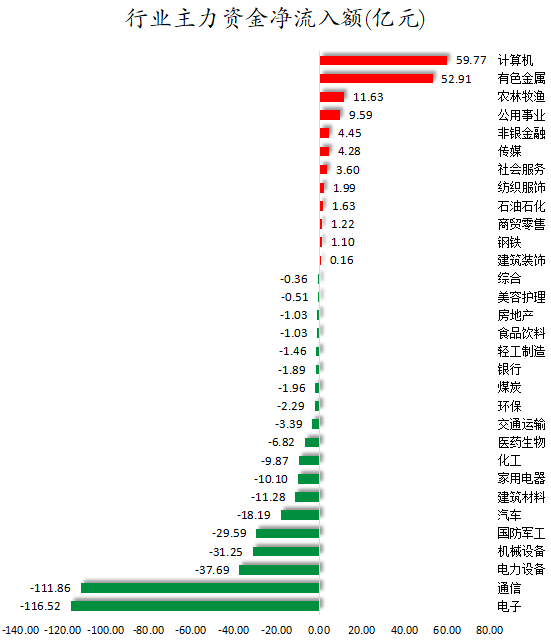 从行业来看,申万所属的31个一级行业,今日有12个行业主力资金呈现净流入,其中,计算机行业主力资金净流入最多,净流入金额为59.77亿元;行业主力资金净流入居前的还有有色金属、农林牧渔、公用事业等,净流入金额分别为52.91亿元、11.63亿元、9.59亿元。19个行业主力资金呈现净流出,其中,电子行业主力资金净流出最多,净流出金额为116.52亿元;行业主力资金净流出靠前的还有通信、电力设备、机械设备、国防军工、汽车等,净流出金额分别为111.86亿元、37.69亿元、31.25亿元、29.59亿元、18.19亿元。