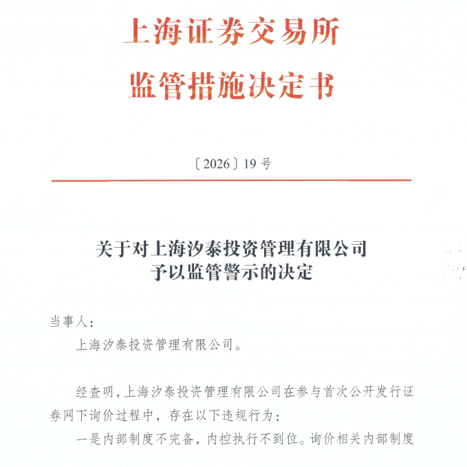 近日,上海证券交易所发布关于对上海汐泰投资管理有限公司(简称“汐泰投资”)予以监管警示的决定。