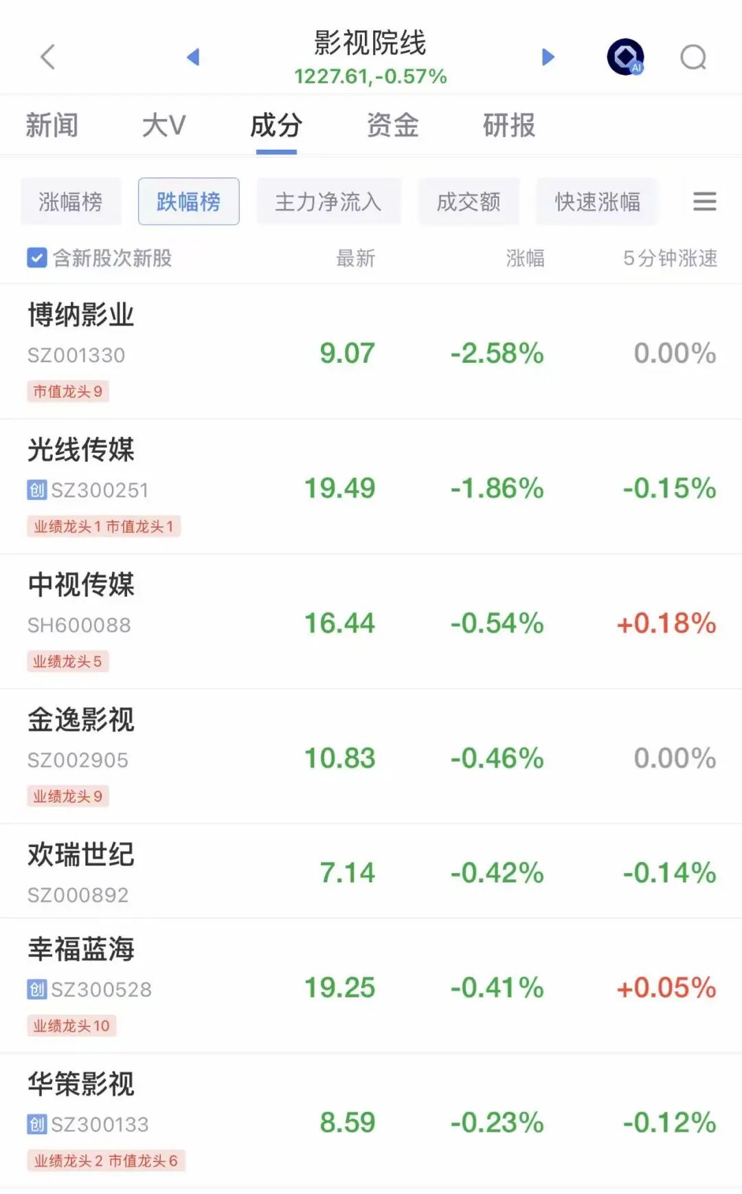 算力芯片股午后集体回暖,跌幅有所收窄 ,盛美上海、明阳电路领跌;影视院线板块持续调整,博纳影业跌幅居前。