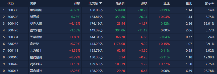 个股方面,据南财金融终端数据显示,全天成交额最高的是中际旭创,达188.06亿元。新易盛、华胜天成、胜宏科技、天孚通信等个股成交额靠前。