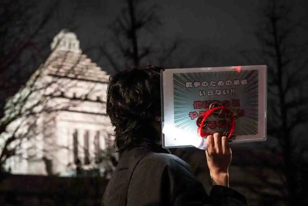 2月24日,大批日本民众在东京众议院第二议员会馆前举行集会,抗议首相高市早苗近期推动加速修宪、扩充军备、强化国家情报能力等政策。新华社记者 贾浩成 摄