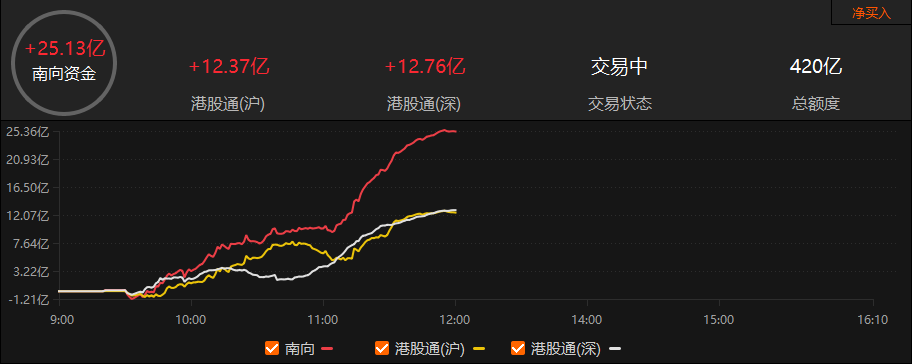 南向资金早盘扭转前两日净卖出态势,半日净买入25.13亿港元。