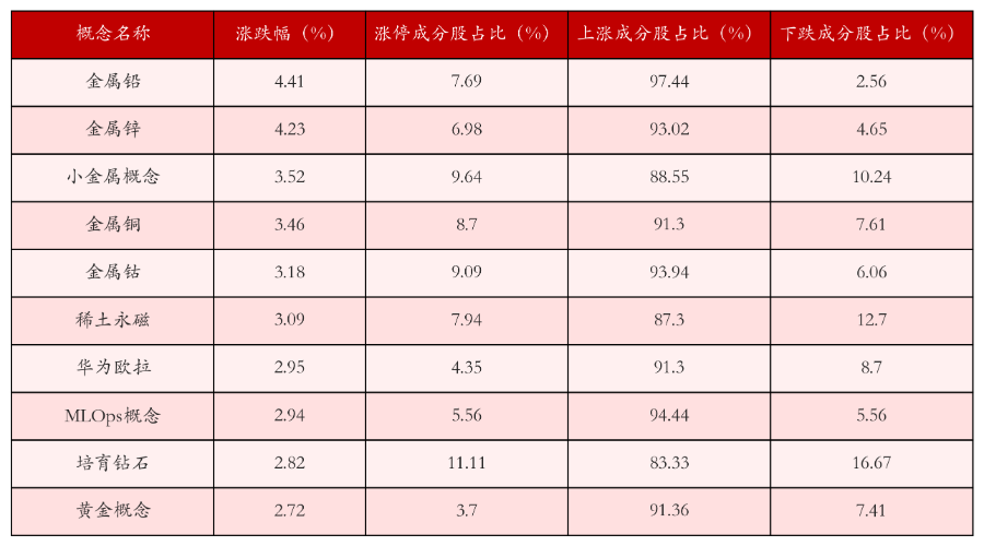 根据A股概念涨跌幅与所对应的股票池综合分析,涨幅靠前的三个概念板块分别为:金属铅、金属锌与小金属概念。排名前10位的概念板块相关数据见下表: