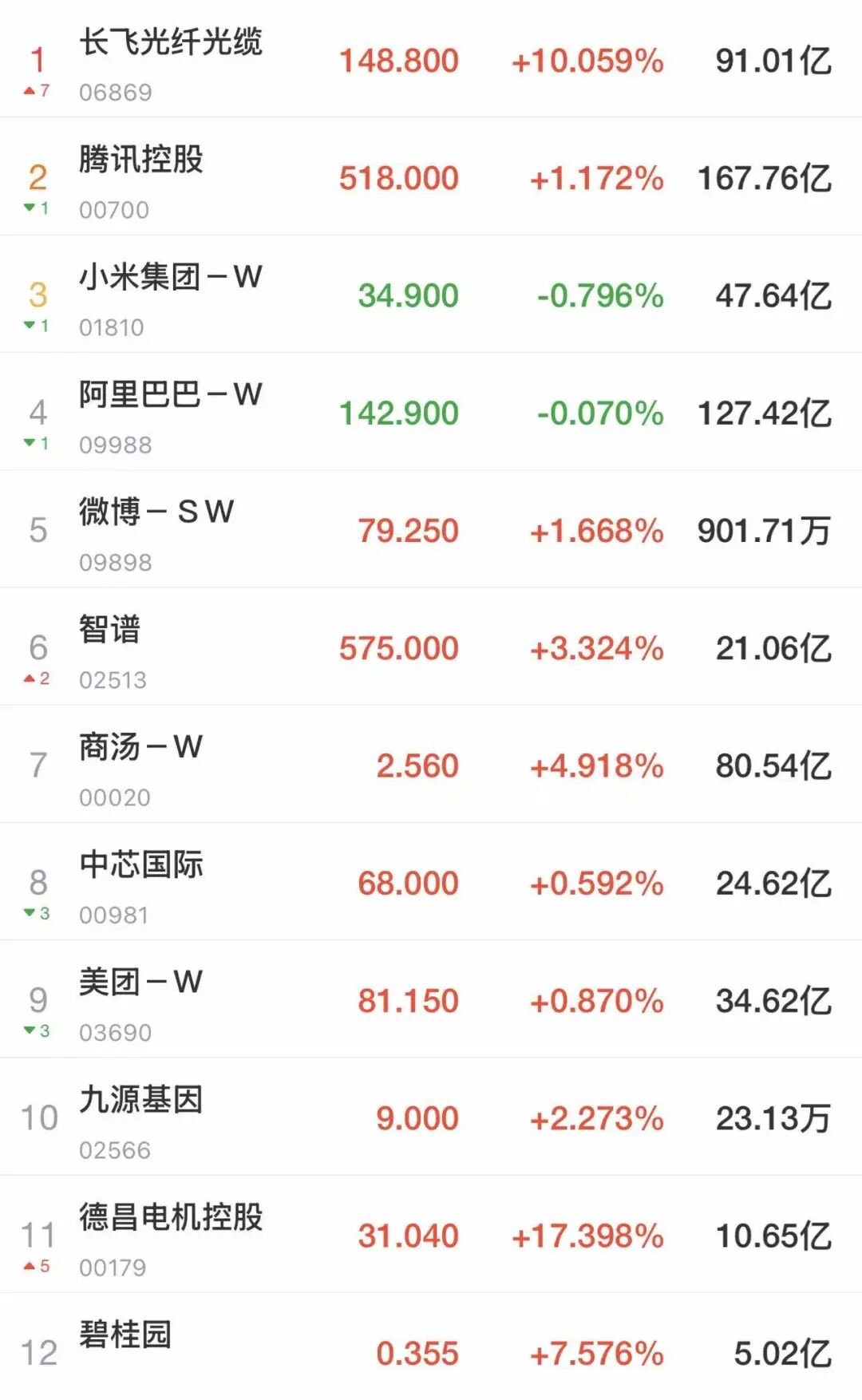 科技巨头方面,腾讯涨超1%,美团、京东、百度等齐涨,阿里一度涨超1.7%,但尾盘转跌。光通信、钢铁、有色、稀土、创新药板块集体大涨。长飞光纤光缆涨近10%,马鞍山钢铁涨6.6%,金力永磁涨6.7%,中国神华涨近6%,昭衍新药涨6%,康希诺生物涨7%,药明生物涨超3%。