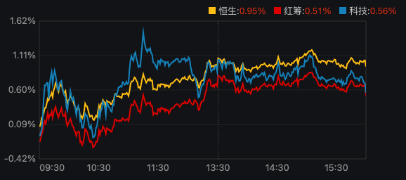 具体来看,当日恒生指数高开高走,收盘报26630.54点,上涨0.95%,成交额2884.20亿港元,较前一交易日(2592.77亿港元)有所放大;恒生科技指数收盘报5137.84点,上涨0.56%,盘中一度涨超1%,成交额714.57亿港元。