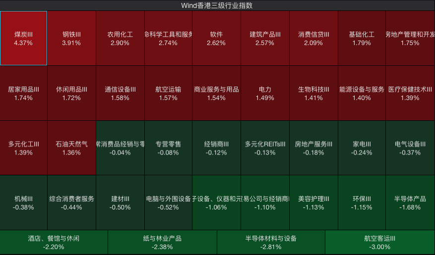 Wind香港三级行业指数中,煤炭Ⅲ(+4.37%)、钢铁Ⅲ(+3.91%)、农用化工(+2.90%)领涨,主要受大宗商品价格回升及国内稳增长政策预期推动;航空客运Ⅲ(-3.00%)、半导体材料与设备(-2.81%)、纸与林业产品(-2.38%)跌幅居前,航空股受春节后机票价格回落拖累,半导体板块或受隔夜英伟达(-5.5%)大跌传导影响。