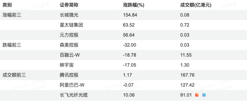 从成交额来看,腾讯控股(167.76亿港元)、阿里巴巴-W(127.42亿港元)、长飞光纤光缆(91.01亿港元)位列前三,其中长飞光纤光缆因纳入MSCI中国指数获资金追捧。