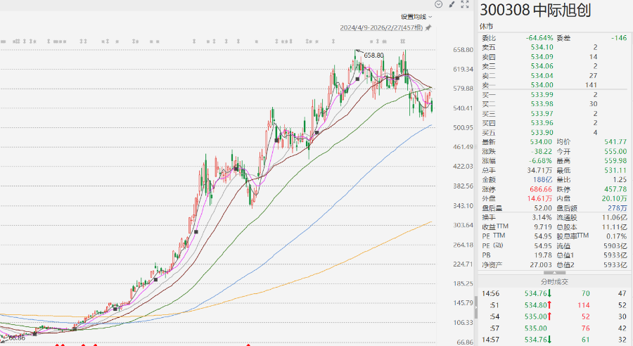 二级市场方面,2月27日中际旭创跌6.68%,最新市值5933亿元。