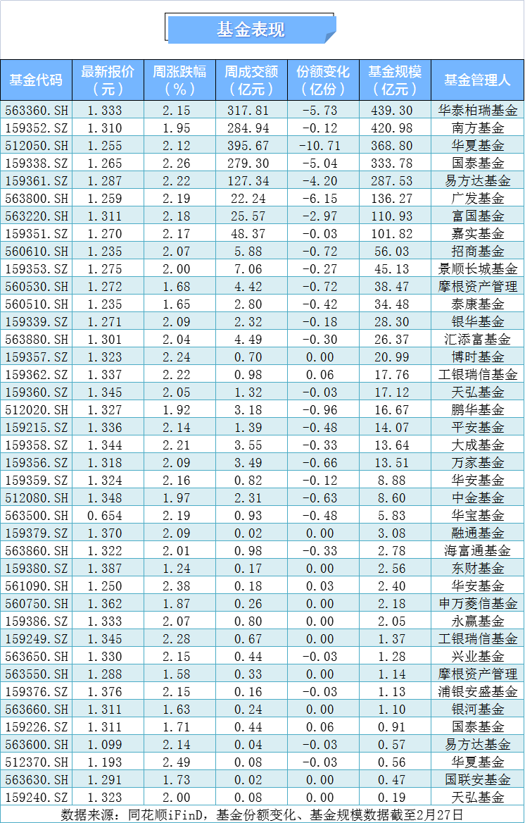 本周中证A500指数涨2.13%,截至2月27日收盘,报5965.35点。受周一休市影响,本周仅有四个交易日,日均成交额为9108.08亿元,环比增长22.57%。整体来看,40只中证A500基金全线上涨,其中A500增强ETF华夏涨幅领涨,涨幅达2.49%。