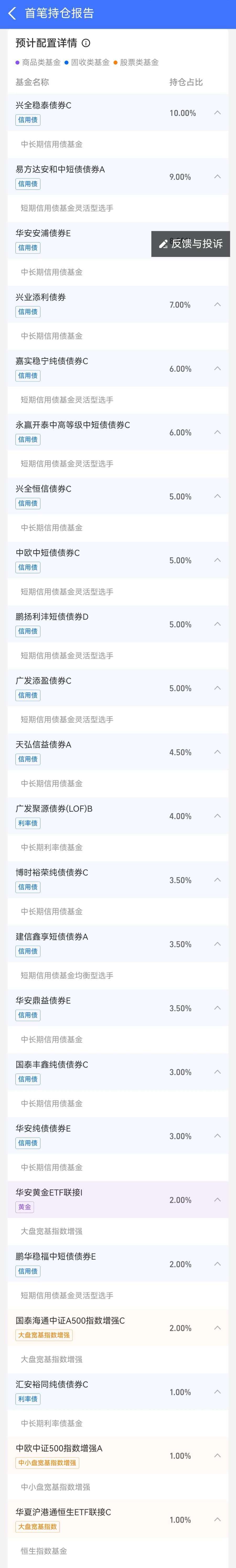 股票类基金中大盘宽基指数增强基金、大盘宽基指数基金、中小盘宽基指数增强基金配置比例分别为2%、1%、1%,预计配置”国泰海通中证A500指数增强C”、“中欧中证500指数增强A”,以及“华夏沪港通恒生ETF联接C”。商品基金则预计配置黄金基金“华安黄金ETF联接I”。