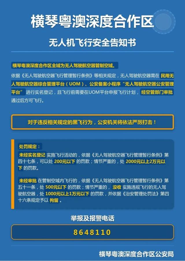 横琴粤澳深度合作区公安局治安警察支队无人机事宜咨询电话:(0756)8648298;无人机“黑飞”举报电话:(0756)8648110。