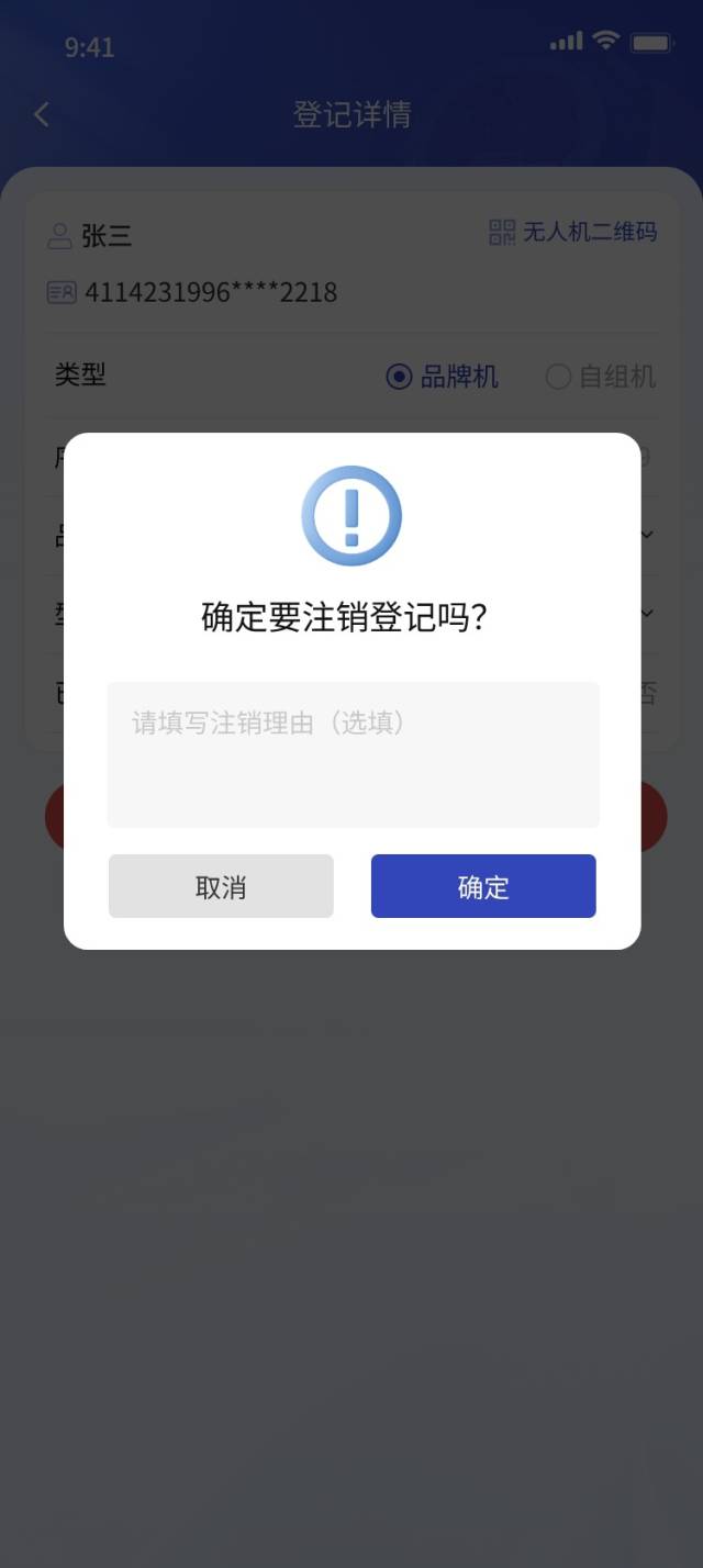 无人机登记详情页中,用户点击底部“注销登记”按钮,填写无人机注销登记理由,可完成无人机注销。