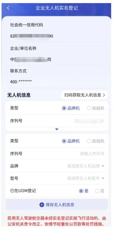 登陆后进入信息填写界面,根据要求填写个人信息和无人机相关信息,提交后完成注册。注册后会生成一个二维码,须打印出来贴在无人机上。
