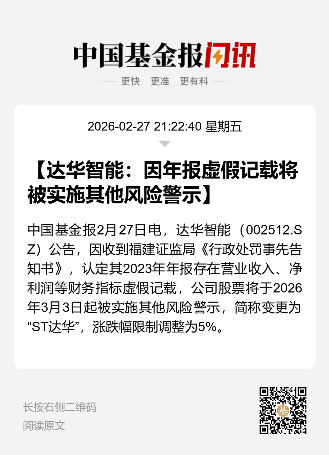 2月27日晚间,达华智能发布公告称,基于福建证监局出具的《行政处罚事先告知书》载明事项,公司自3月3日开市起将被实施其他风险警示,证券简称变为ST达华,交易日涨跌幅限制由10%变为5%。