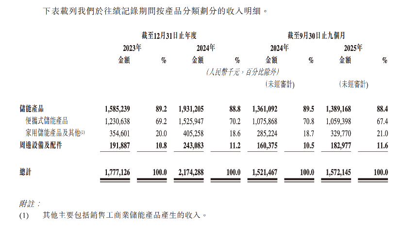 作为公司的基本盘,便携式储能产品(覆盖100Wh至2750Wh全容量段)贡献了截至2025年9月总营收的67.4%,家用储能及其他业务占比21%,周边设备及配件占比11.6%。