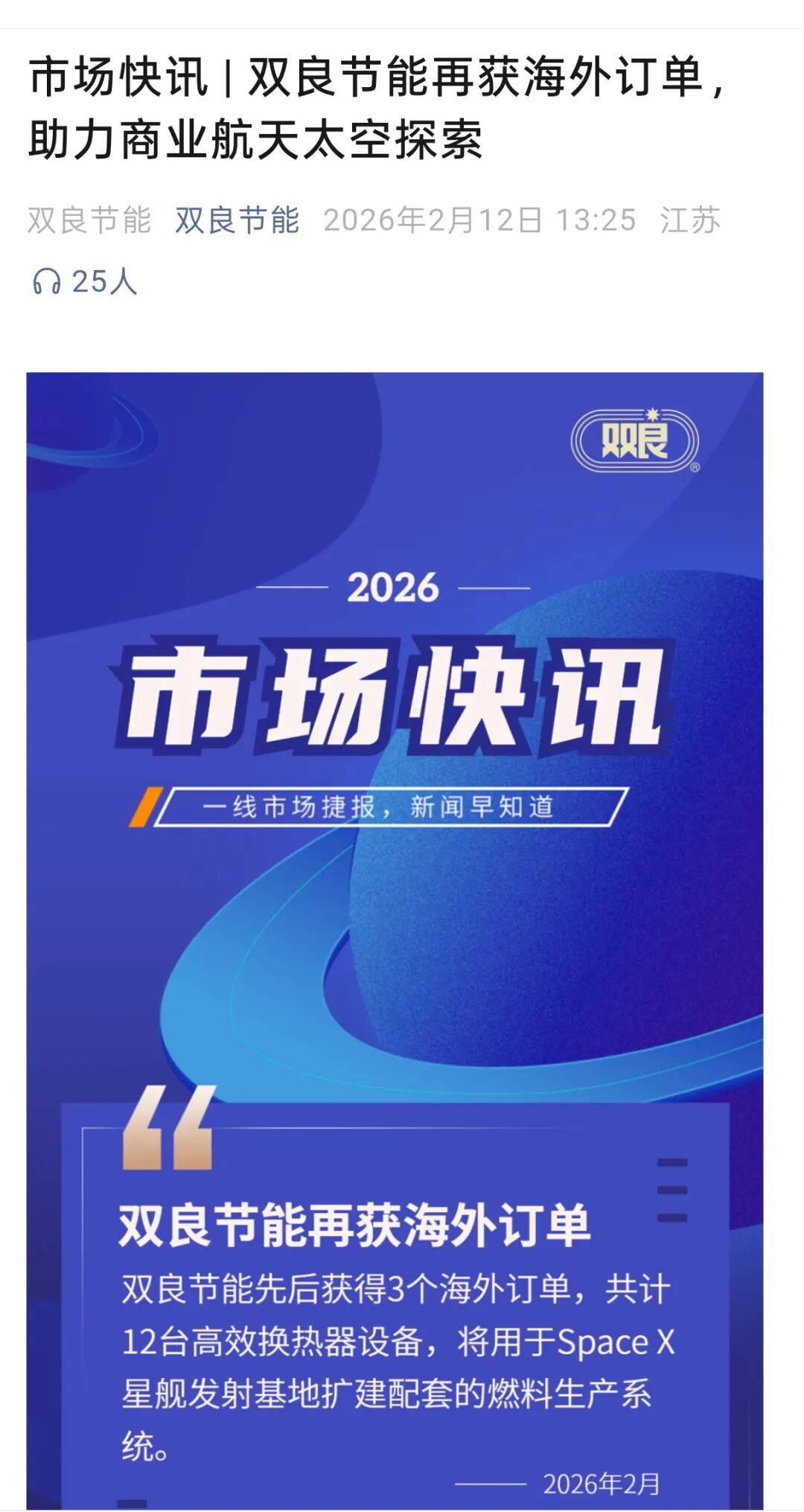 2月12日13时25分,公司公众号发布快讯称,先后获得3个海外订单、共计12台高效换热器设备,将用于SpaceX星舰发射基地扩建配套的燃料生产系统,并称这是继前期合作后再度供货,以此彰显海外客户对其产品的认可。