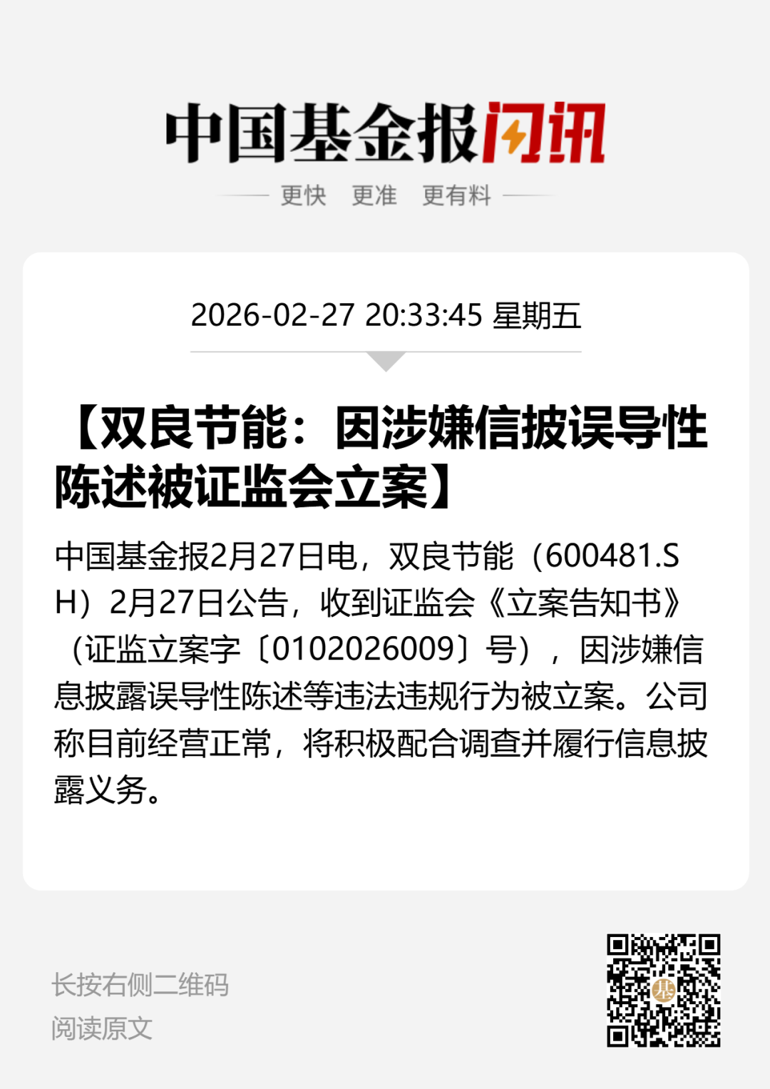 2月27日晚间,双良节能(证券代码:600481)发布公告称,公司当日收到中国证监会下发的《立案告知书》,因涉嫌信息披露误导性陈述等违法违规行为,证监会决定对其立案调查。