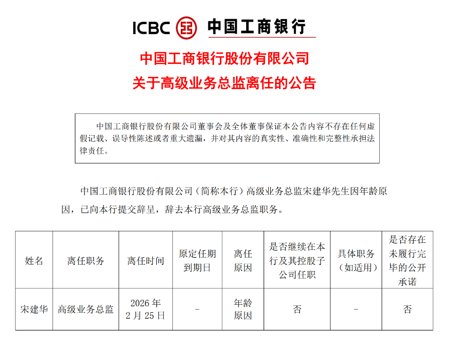 近日,中国工商银行(以下简称“工行”)发布公告称,该行高级业务总监宋建华先生因年龄原因,已提交辞呈,辞去高级业务总监职务。至此,工行2020年首批聘任的高级业务总监已全部到龄离任。