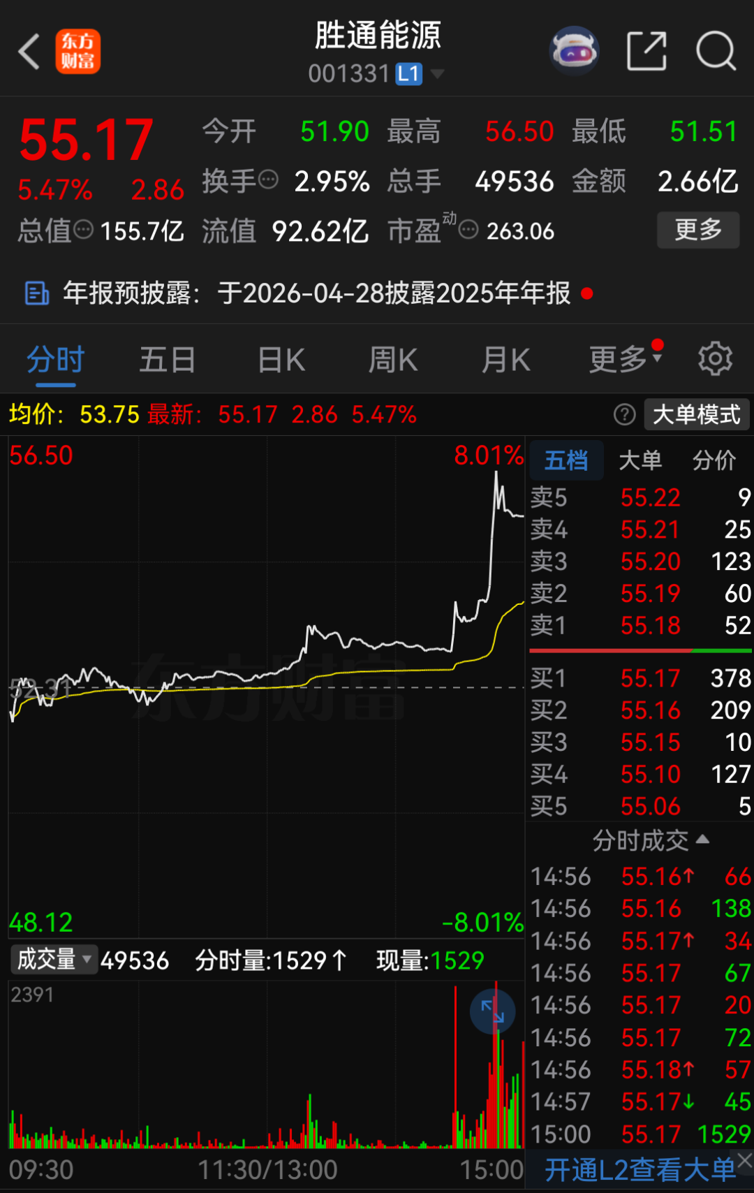 2月27日尾盘,胜通能源突然大涨,股价报收于55.17元/股,涨幅达5.47%,总市值为155.70亿元。