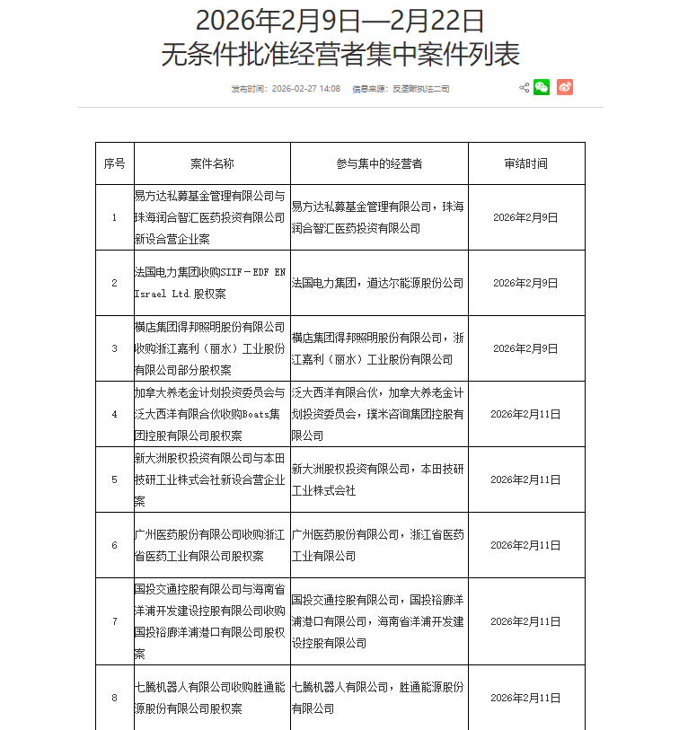 消息面上,国家市场监督管理总局官网同日发布2026年2月9日—2月22日无条件批准经营者集中案件列表,其中包括七腾机器人有限公司(以下简称七腾机器人)收购胜通能源股权案,审结时间为2026年2月11日。