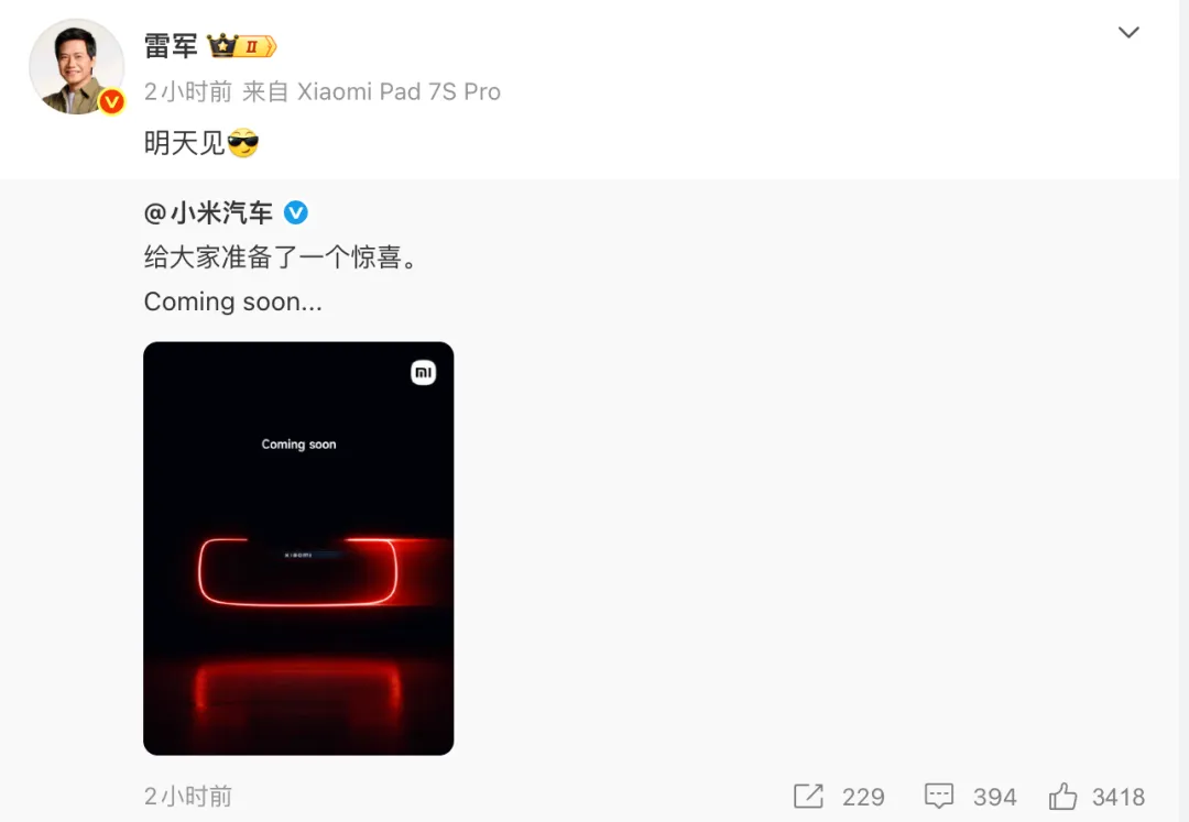 据悉,小米汽车官方微博当天发文称,“给大家准备了一个惊喜”。小米创始人、董事长兼CEO雷军转发该条微博并配文“明天见”。