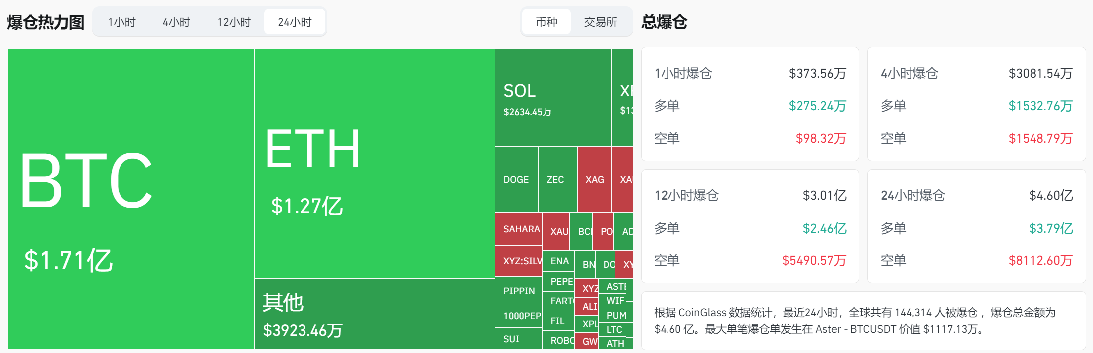 截至2月28日晚20时30分,CoinGlass数据显示,过去24小时内,全球共有144384名投资者“爆仓”,爆仓总金额高达4.60亿美元。其中,比特币品种爆仓金额达1.71亿美元;以太币爆仓1.27亿美元。