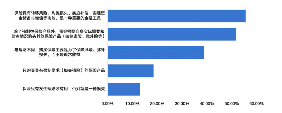 消费者对保险退保的认知基本准确,67.82%的消费者知道在“保险合同规定的犹豫期内可以退保”,但对保险理赔存在误解,多数人(55.15%)不了解向多家保险公司重复投保财产险不可以获得超过损失额度的重复赔偿。76.92%的消费者知道不良信用记录会影响申请贷款,但了解个人信用报告不良记录保存年限的消费者只有46.47%。约半数消费者(50.68%)能够正确认识非法集资损失不受法律保护,参与者需自担风险。