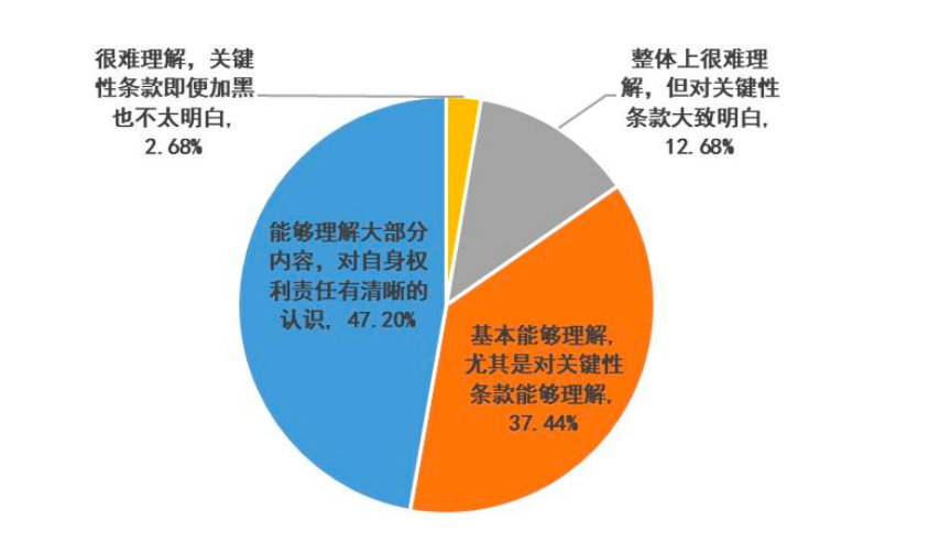 金融行为方面,调查显示,消费者持有金融资产主要集中在活期存款(77.72%)、现金(69.83%)及定期存款(59.48%)等常规金融资产上,持有银行理财产品、股票等金融资产的消费者占比36.90%,持有贵金属的消费者占比 6.24%。消费者阅读合同的能力有待提升,49.95%的消费者会仔细阅读合同条款,其他消费者仅简要阅读或不阅读合同。47.20%的消费者能够理解大部分内容,37.44%的消费者基本能够理解,12.68%的消费者对关键性条款大致明白,2.68%的消费者很难理解。