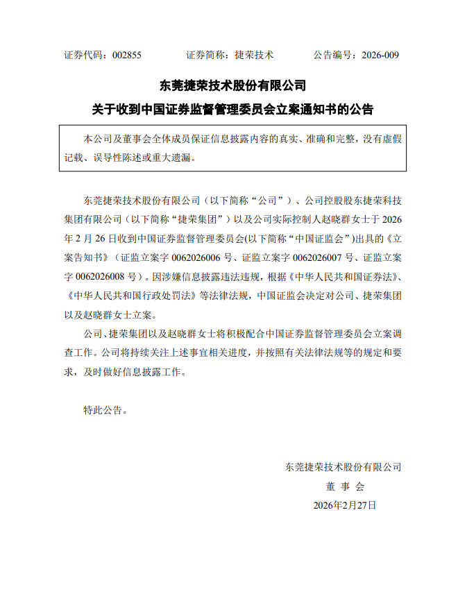 2026年2月28日公司发布《关于收到中国证券监督管理委员会立案通知书的公告》,东莞捷荣技术股份有限公司、公司控股股东捷荣科技集团有限公司(下称“捷荣集团”)以及公司实际控制人,收到中国证券监督管理委员会出具的《立案告知书》(证监立案字0062026006号、证监立案字0062026007号、证监立案 字0062026008 号),因涉嫌信息披露违法违规被证监会立案调查。