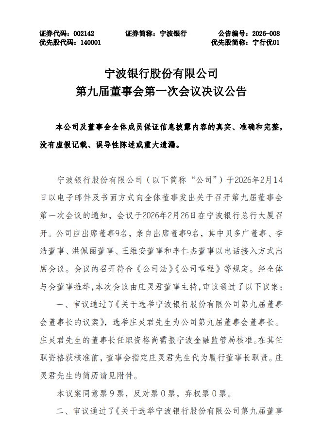 2月26日,宁波银行发布公告,宣布一系列人事变动。核心调整包括选举庄灵君为新任董事长,同意聘任冯培炯为新任行长。