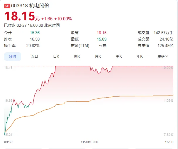 2月27日,杭电股份强势涨停,收盘价为18.15元,成交额为24.10亿元,总市值攀升至125.48亿元。据统计,自2026年1月30日以来的15个交易日内,杭电股份股价累计涨幅超过120%,表现非常亮眼。