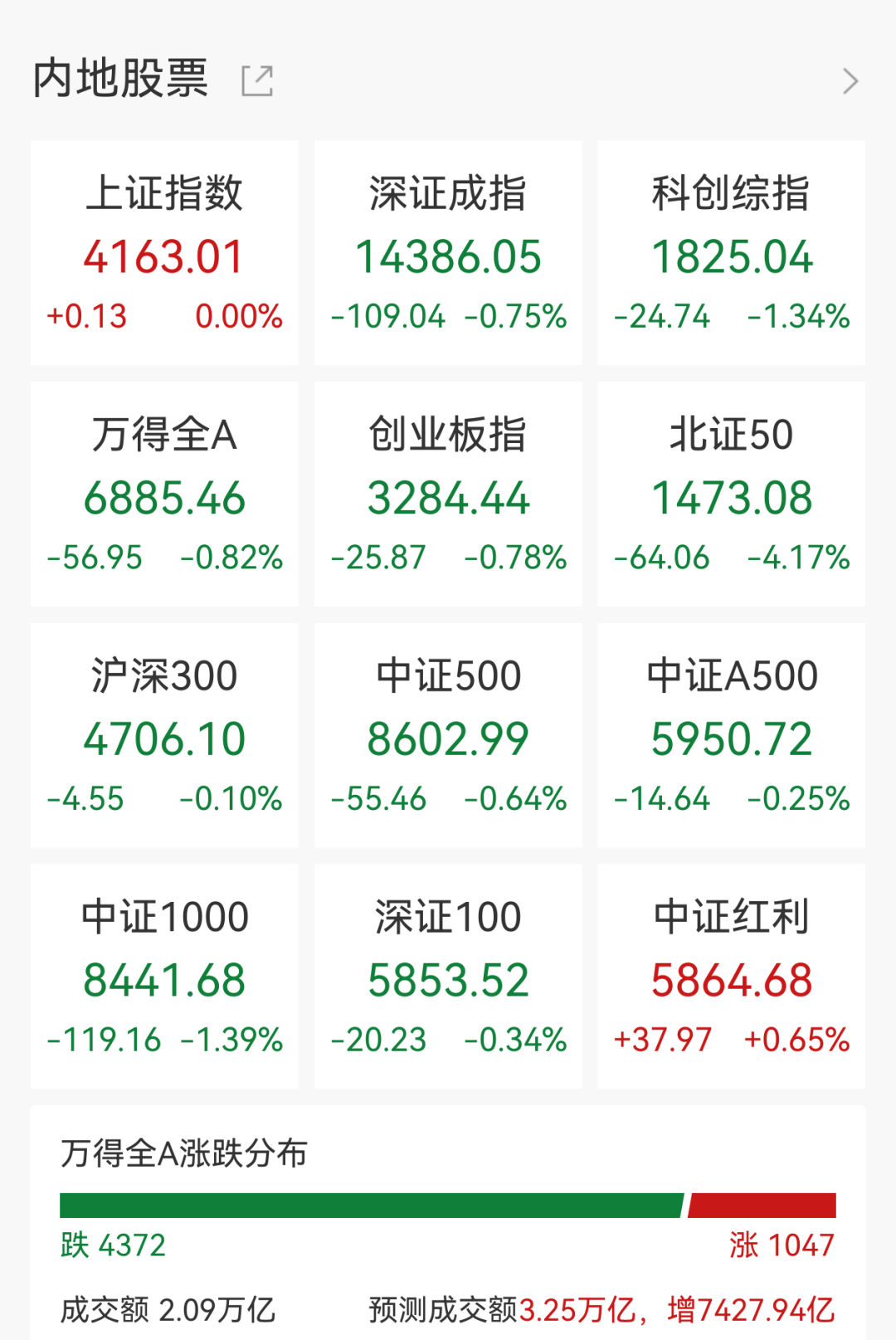 3月2日,市场早盘集体低开,创业板指、深成指盘中均跌超1%。截至午盘,沪指翻红,深成指跌0.75%,创业板指跌0.78%, 科创综指跌1.34%, 北证50指数跌4.17%。两市成交额半日突破2万亿,全市场超4300只个股下跌。