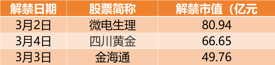 从解禁市值来看,3月2日是解禁高峰期,14家公司解禁市值合计216.17亿元,占下周解禁规模的59.58%。按2月27日收盘价计算,解禁市值居前三位的是:微电生理(80.94亿元)、四川黄金(66.65亿元)、金海通(49.76亿元)。从个股的解禁量看,解禁股数居前三位的是:中材国际(3.67亿股)、微电生理(3.46亿股)、四川黄金(1.32亿股)。