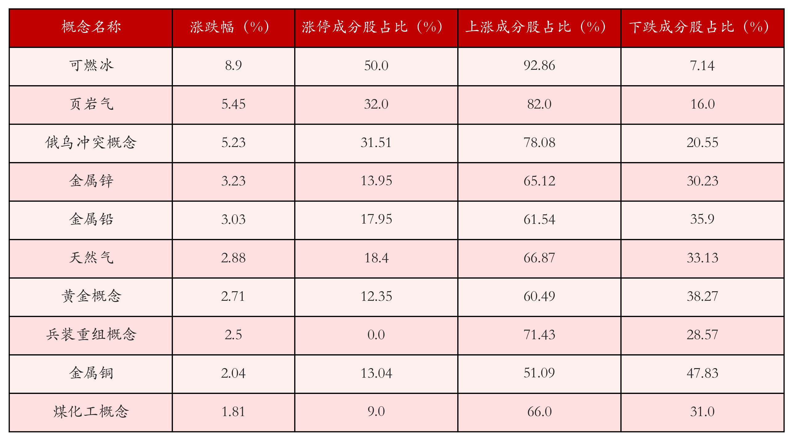 根据A股概念涨跌幅与所对应的股票池综合分析,涨幅靠前的三个概念板块分别为:可燃冰、页岩气与俄乌冲突概念。排名前10位的概念板块相关数据见下表: