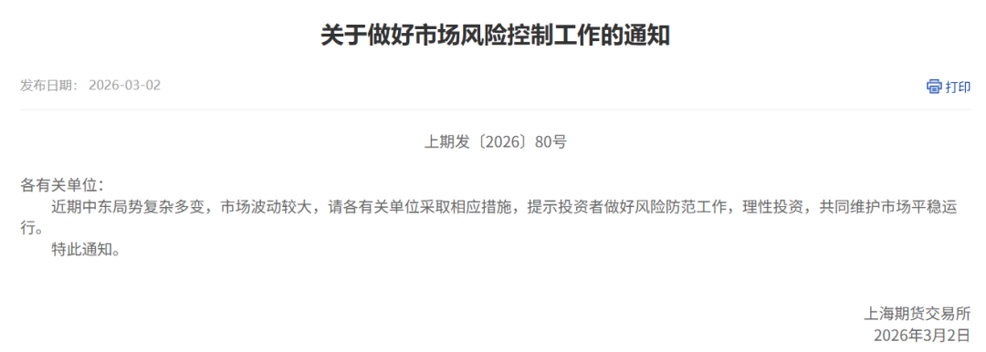 上期所、上期能源通知:近期中东局势复杂多变,市场波动较大,请各有关单位采取相应措施,提示投资者做好风险防范工作,理性投资,共同维护市场平稳运行。