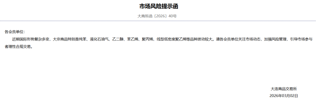 大商所发布风险提示函:近期国际形势复杂多变,大宗商品特别是纯苯、液化石油气、乙二醇、苯乙烯、聚丙烯、线型低密度聚乙烯等品种波动较大。请各会员单位关注市场动态,加强风险管理,引导市场参与者理性合规交易。