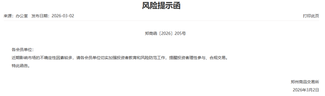 郑商所发布风险提示函:近期影响市场的不确定性因素较多,请各会员单位切实加强投资者教育和风险防范工作,提醒投资者理性参与、合规交易。