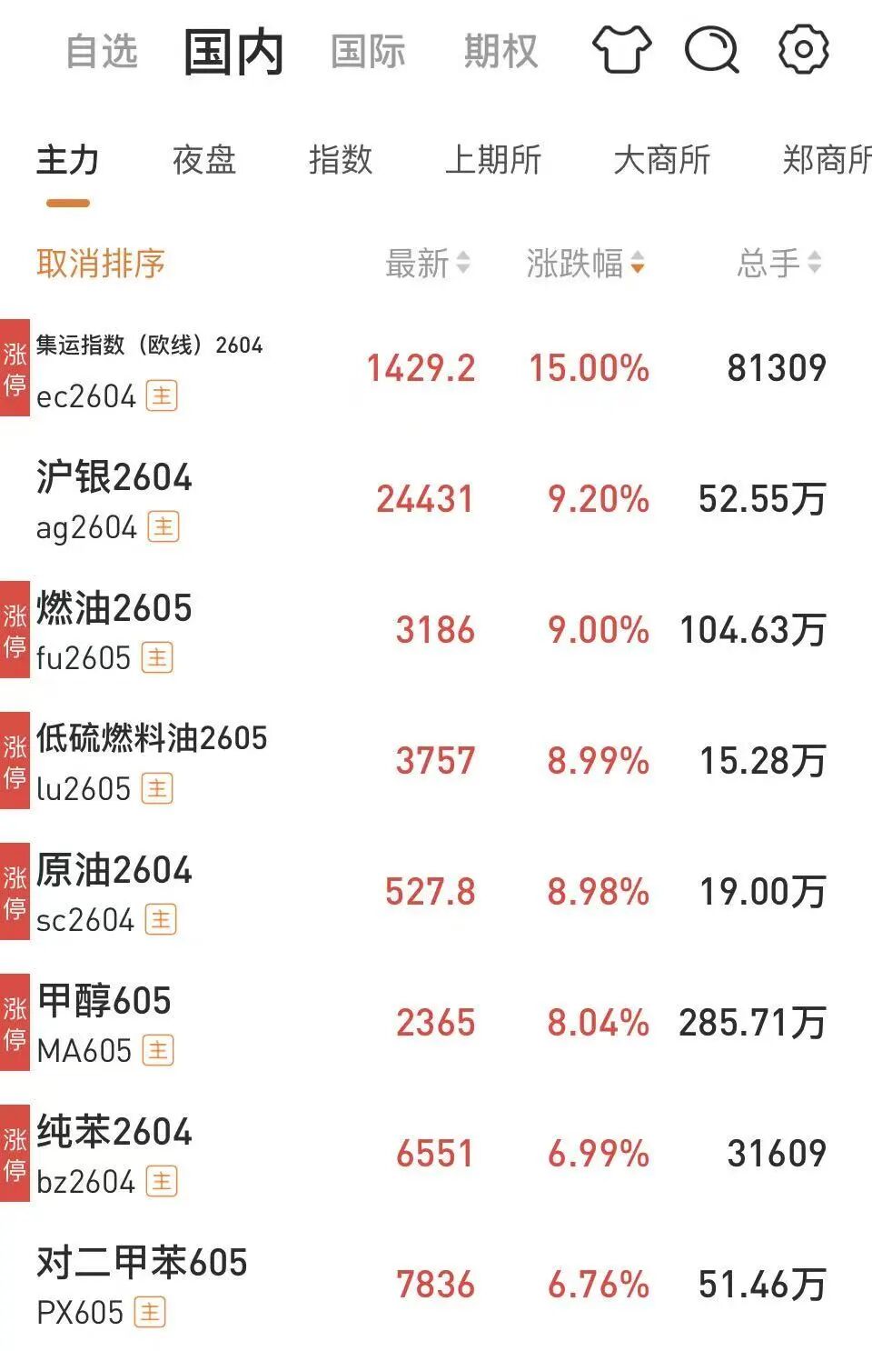 受中东地缘局势紧张影响,今日国内商品期货大面积收涨,能化板块多个品种涨停。截至15时收盘,集运指数(欧线)期货主力合约涨停,涨幅15%;燃油、低硫燃料油、原油期货涨停,涨幅9%;甲醇期货涨停,涨幅8%;纯苯期货涨停,涨幅7%。