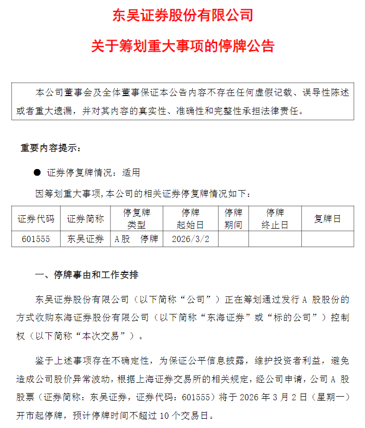 3月2日早间,东吴证券(601555.SH)公告,公司正在筹划发行股份收购东海证券控制权事项。因该事项存在不确定性,为维护投资者利益,公司股票自2026年3月2日开市起停牌,预计停牌时间不超过10个交易日。